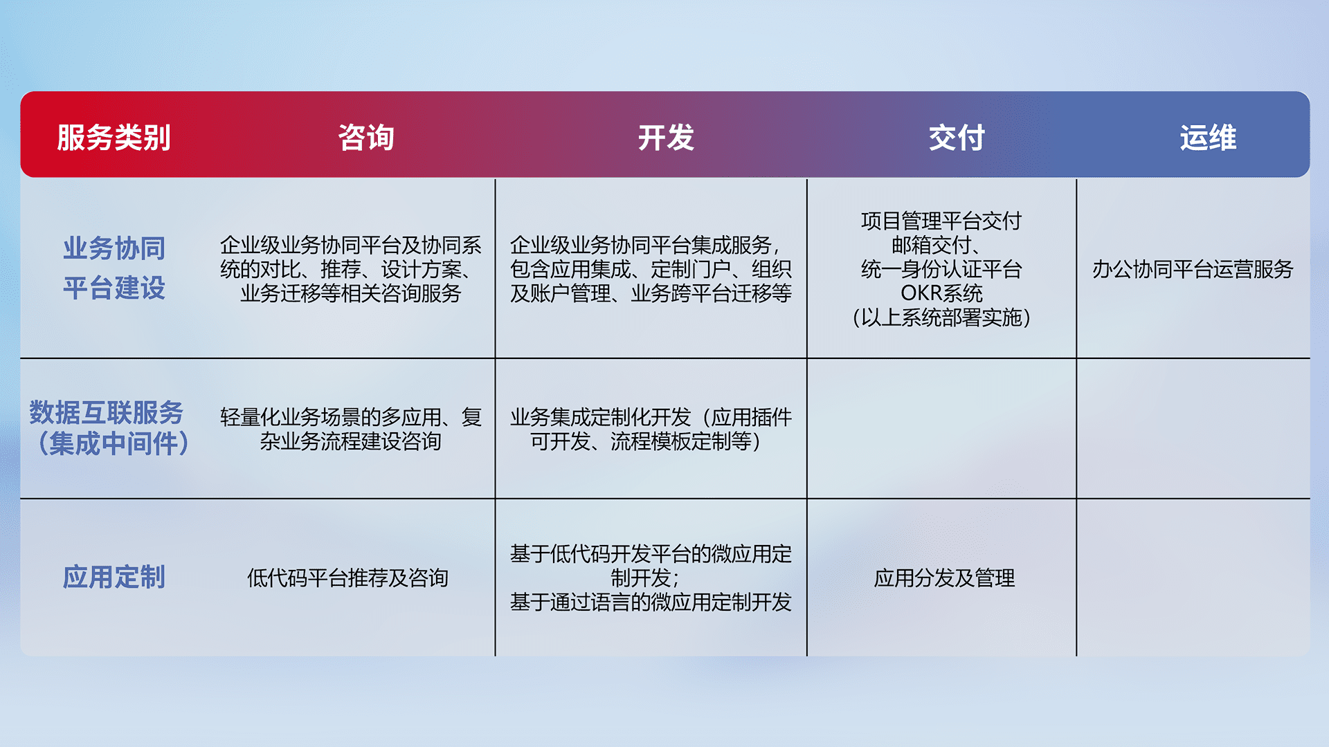 针对钉钉、、、企微、、IDaas等平台级产品提供产品的规划、、方案、、、交付、、、定制化开发等服务,,,,实现如统一协同办公、、智能客户服务、、、混合会议管理、、、、智能数据查询、、、等业务场景,,实现数字化转型。。