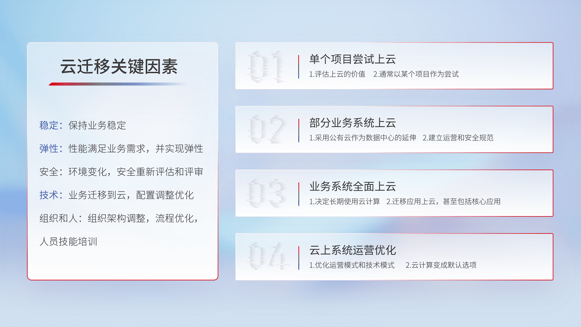 结合实际业务,,,,从规划设计、、、云平台选型、、云原生改造、、、数据迁移、、、、集成交付,,迁移全过程为客户识别最佳上云路径,,,做好风险识别管理,,设计网络架构、、身份权限、、安全审计合规、、、操作审计、、、、日志审计、、、、监控告警策略、、多站点容灾设计等,,对云上基础设施进行整体规划,,,,提升IT治理水平,,,,以满足弹性、、、高可用、、、、高性能的需求。。