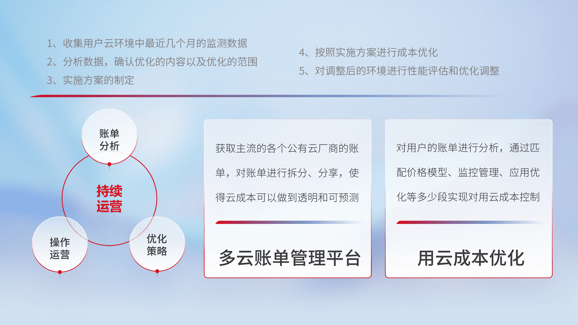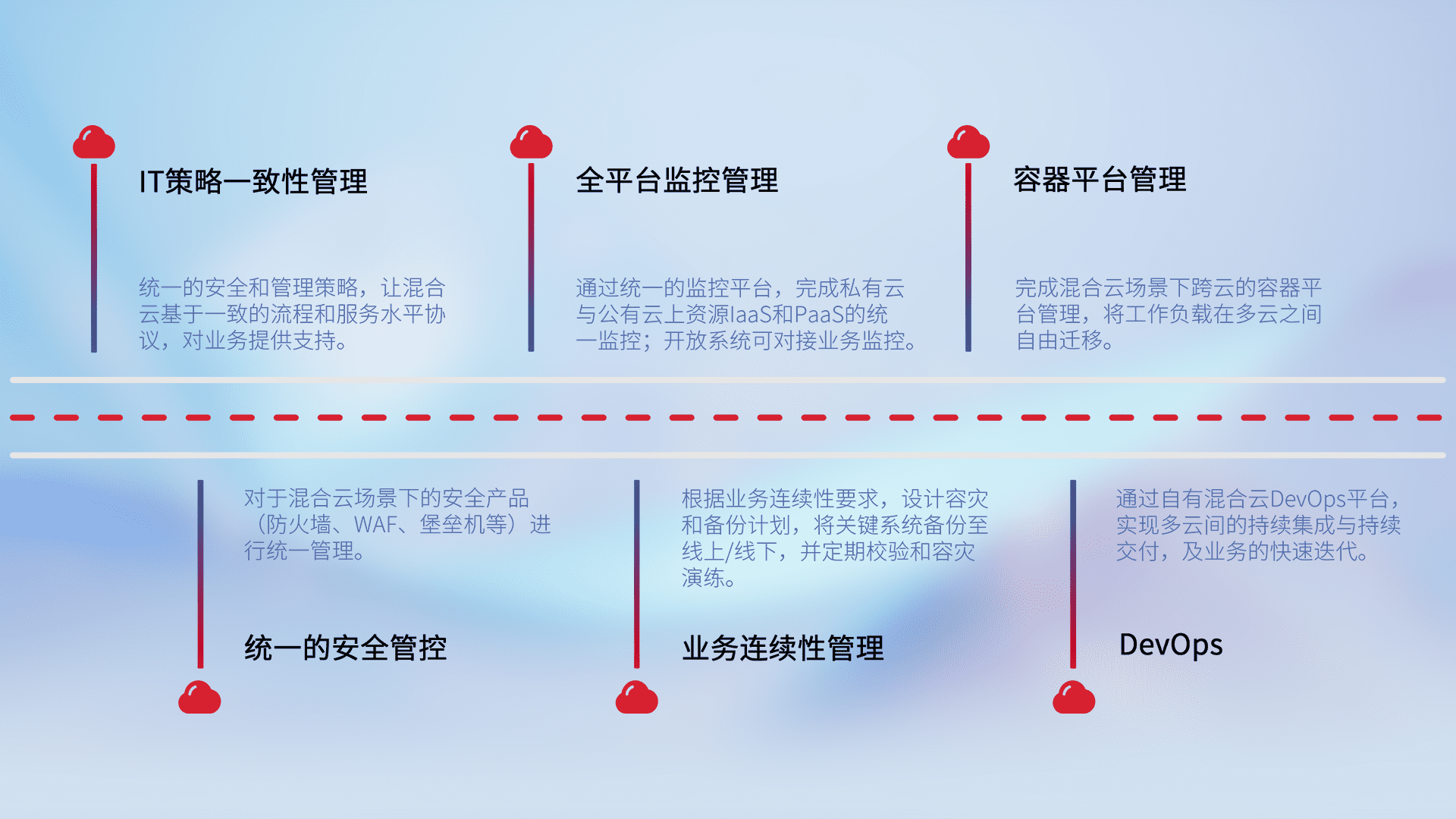 通过多云纳管,,以统一的资源数据模型把客户的云资源进行抽象和封装,,进而实现对多云资源的统一操作,,,保障云资源管理的可靠性、、、稳定性与可用性。。。。量身定制化运维内容,,,配置、、开发运维、、、补丁管理、、、、备份、、、、监控、、、认证和访问管理、、、、审计和日常巡检等,,保障在用云过程中的可靠度,,,稳定度以及高可用率。。